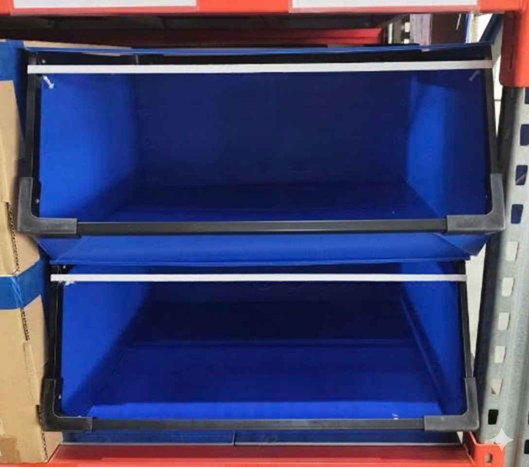 Structural Integrity: Despite the side openings, these bins are technically calculated to remain stackable and rigid under load within the racking units.