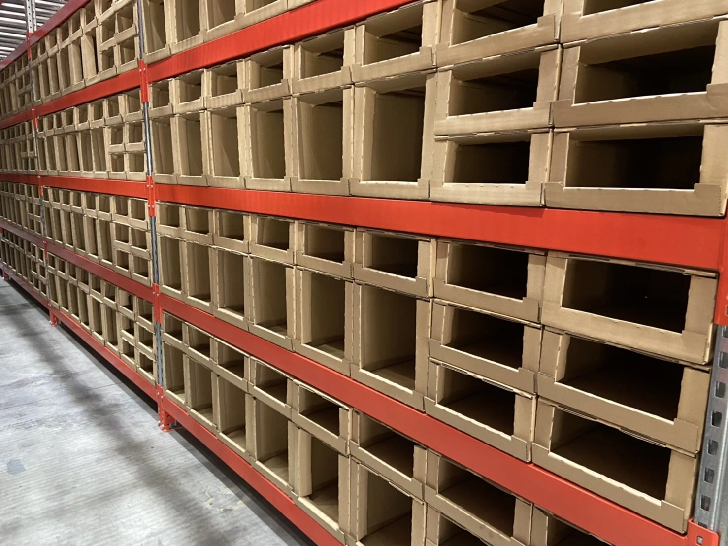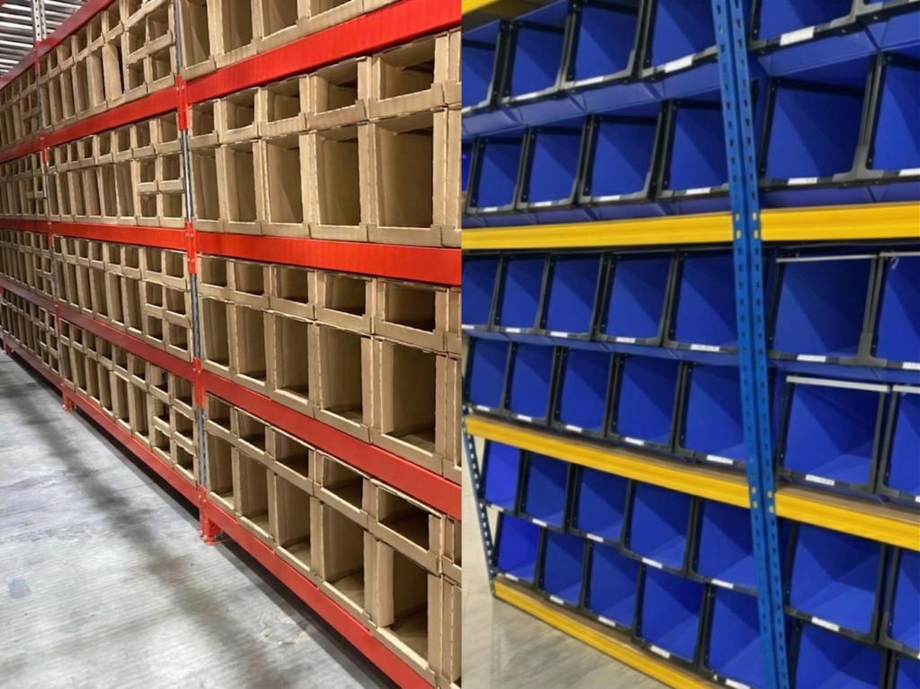 Carton bins on steel shelving